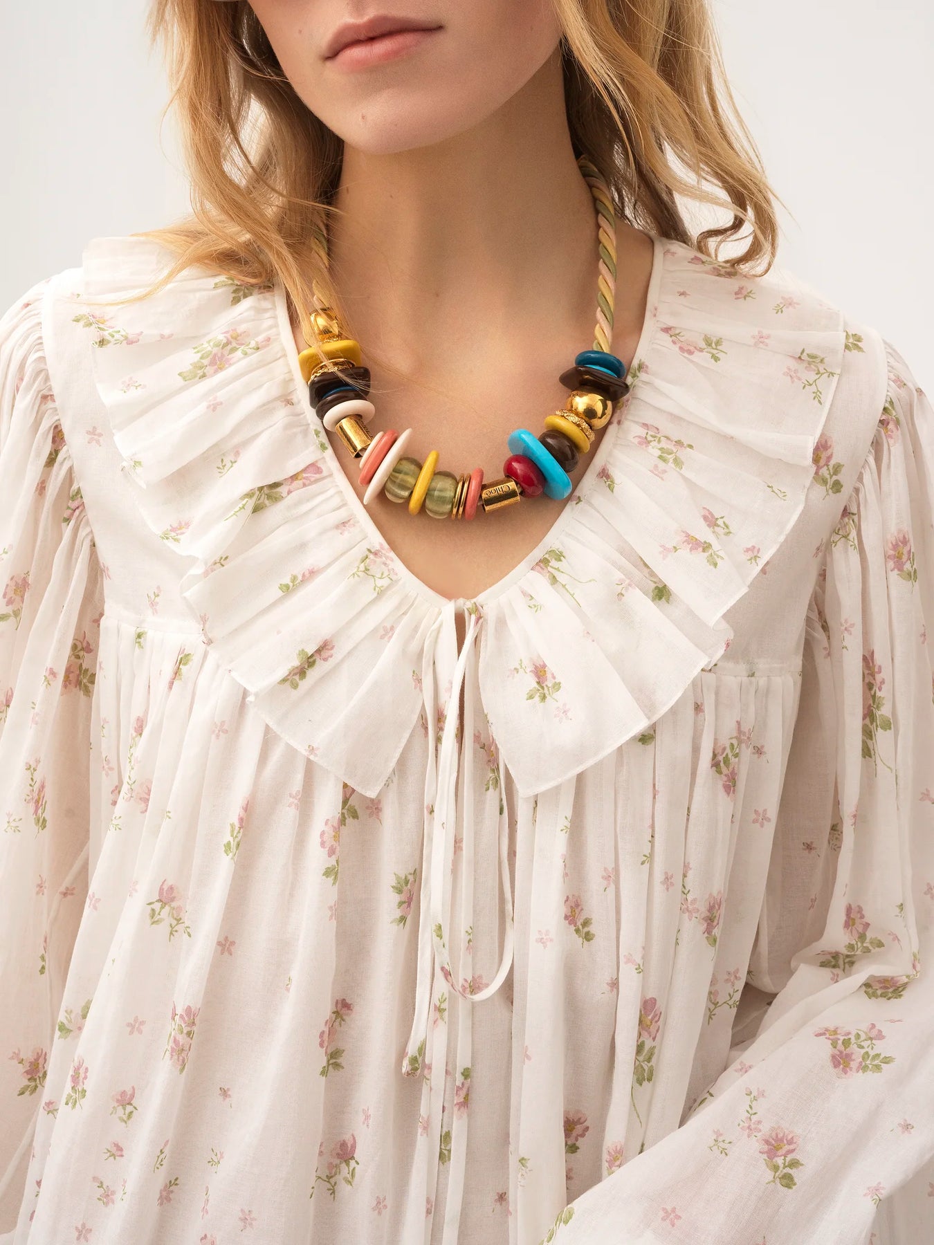 Mini robe manches longues froncée en voile de coton à imprimé floral Liberty, avec col V et doublure en soie mélangée. Des détails de volants et des liens à nouer à embouts dorés complètent la pièce.