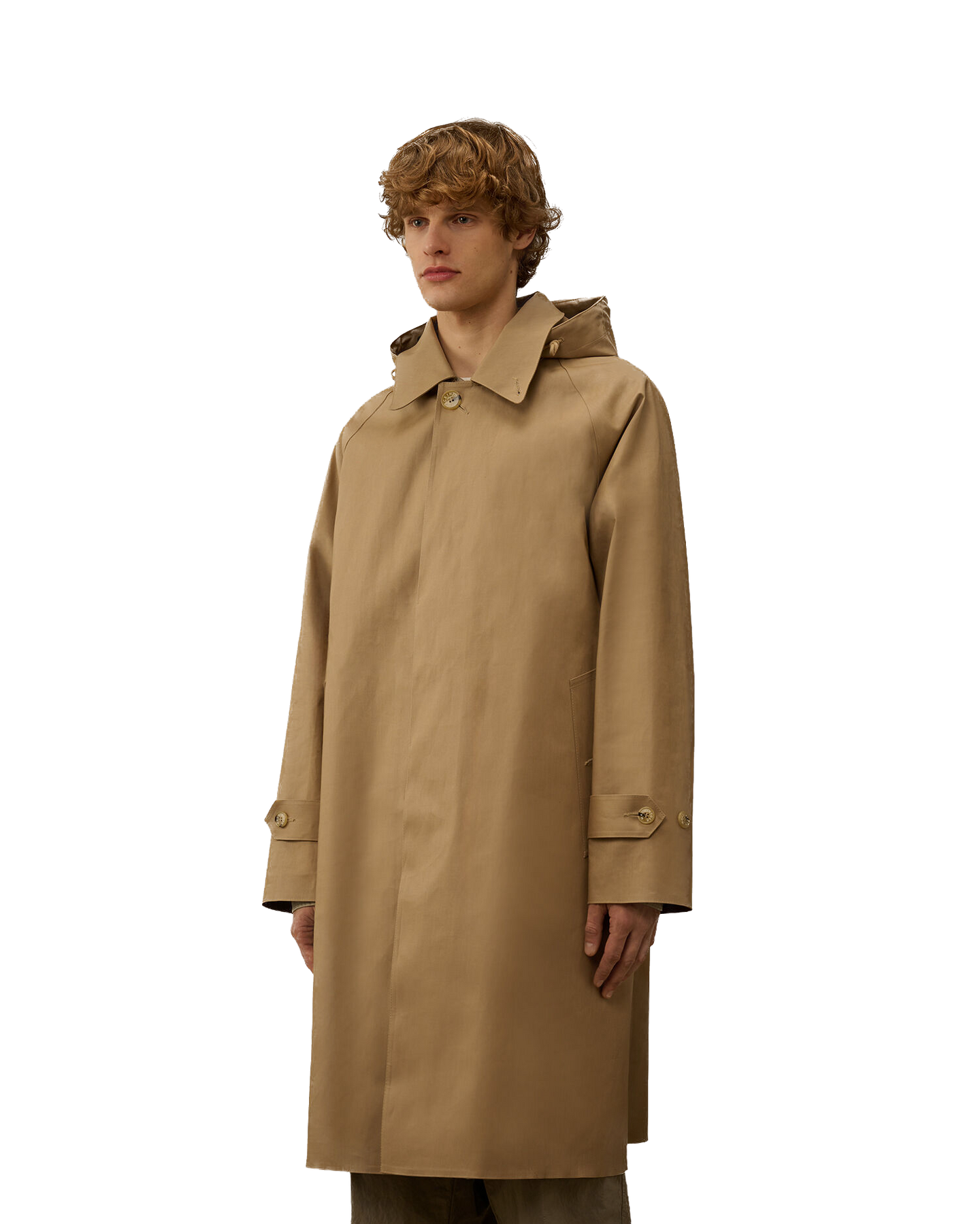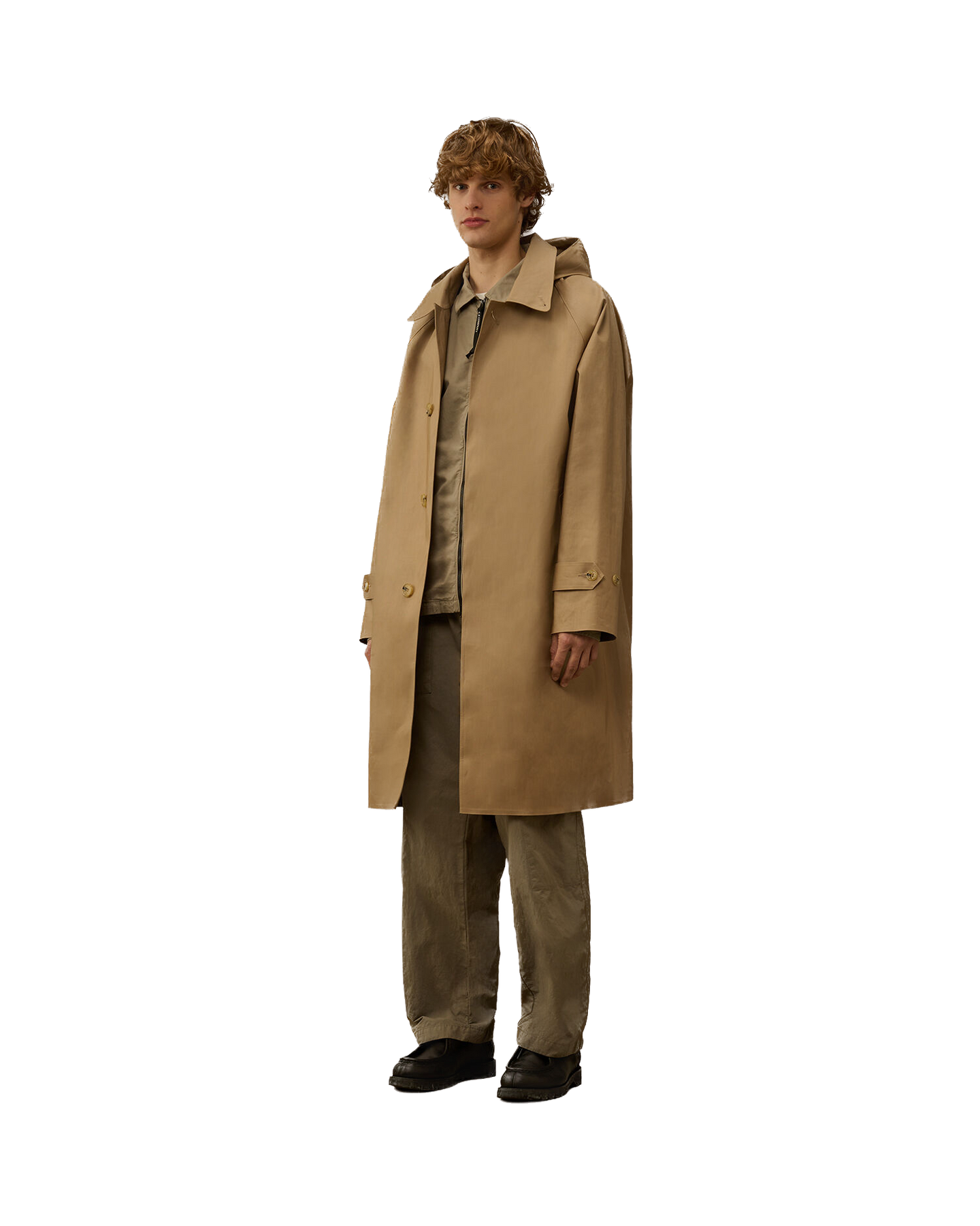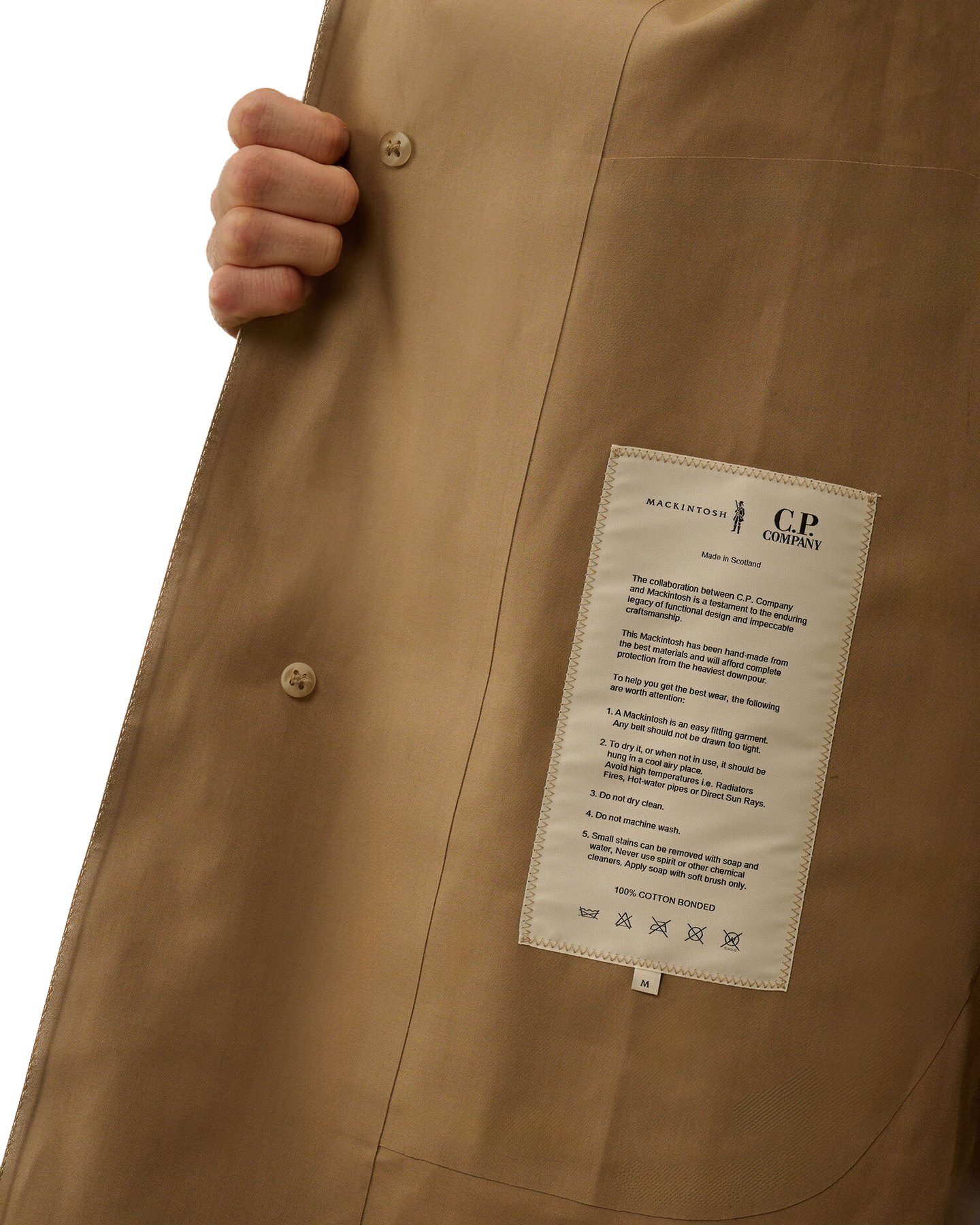 Manteau en coton contrecollé, fabriqué en Écosse dans le cadre d'une collaboration entre Mackintosh et C.P. Company. Le tissu en coton double épaisseur, contrecollé avec une membrane caoutchoutée, offre une protection optimale contre l'eau et le vent tout en conservant une esthétique raffinée. Chaque panneau de tissu est cousu, fixé et scellé à la main à l'aide d'une colle spéciale, et les coutures sont recouvertes d'un ruban imperméable appliqué et pressé à la main afin de garantir une imperméabilité et une durabilité maximales.Le manteau est doté de la capuche Goggle emblématique, réglable à l'aide de cordons élastiques et amovible grâce à des boutons-pression. Le col peut être porté relevé ou rabattu grâce à un bouton de fixation. La fermeture avant est dotée de boutons cachés recouverts d'un rabat, avec un seul bouton visible. Le manteau est complété par des poches passepoilées en biais avec boutons cachés, des poignets réglables avec des sangles à boutons et une fente arrière réglable. Coupe classique.