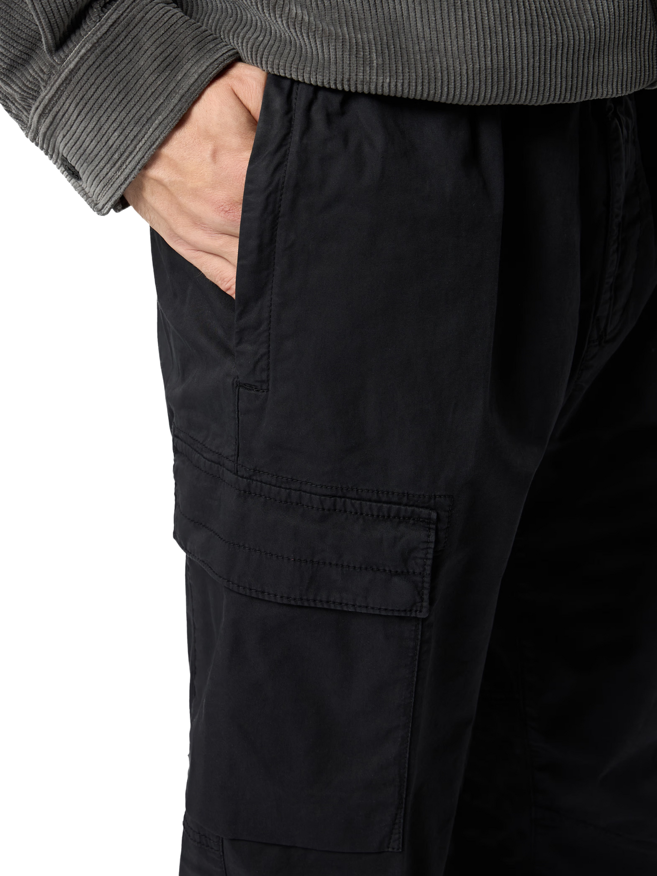 Pantalon cargo en sergé de coton extensible Supima®, avec poches mains à glissière dissimulée et poches pressionnées sur les jambes ; chevilles et taille élastiquées. Modèle teint en pièce.