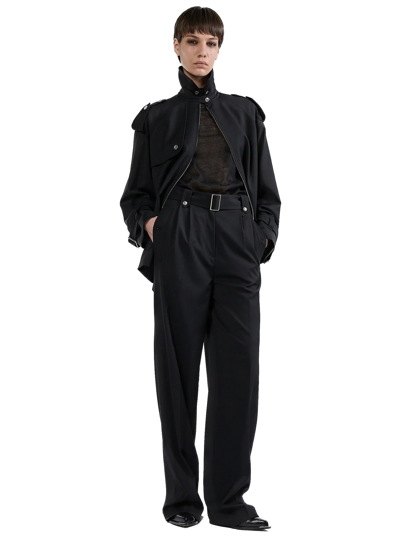 Épicentre de la silhouette, ce pantalon à plis insuffle une attitude chic et nonchalante à vos looks favoris. Adoptant une coupe taille haute à jambe large pour conjuguer féminité et accents androgyne, ce pantalon femme se décline dans une confortable gabardine de laine stretch dans trois coloris : noir, bleu denim ou camel. Sa ceinture intégrée est parfaitement maintenue à l'aide d'une boucle de serrage carrée et de passants boutonnés, des détails au chic utilitaire qui ne sont pas sans rappeler les éléments traditionnellement associés au trench-coat. Ses poches passepoilées à l'arrière et ses poches frontales sont elles aussi dotées de boutons choisis dans une version noire minimaliste ou dans un effet corne pour le modèle camel.