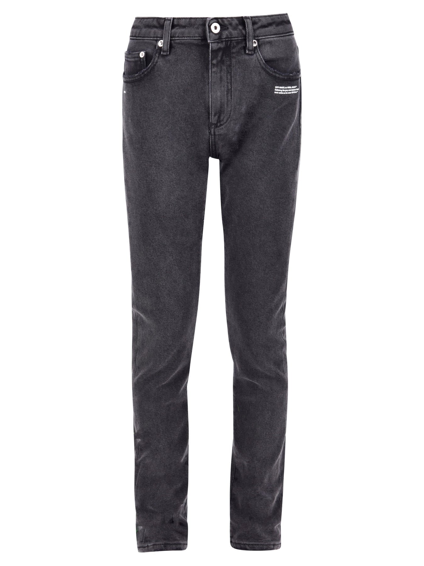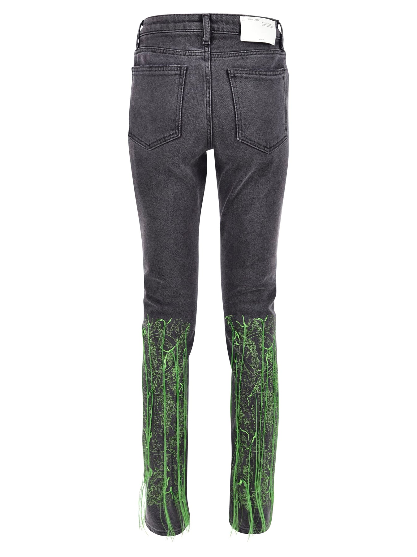 Jean Off-White avec des broderies vertes, 5 poches et une inscription au niveau de la poche.