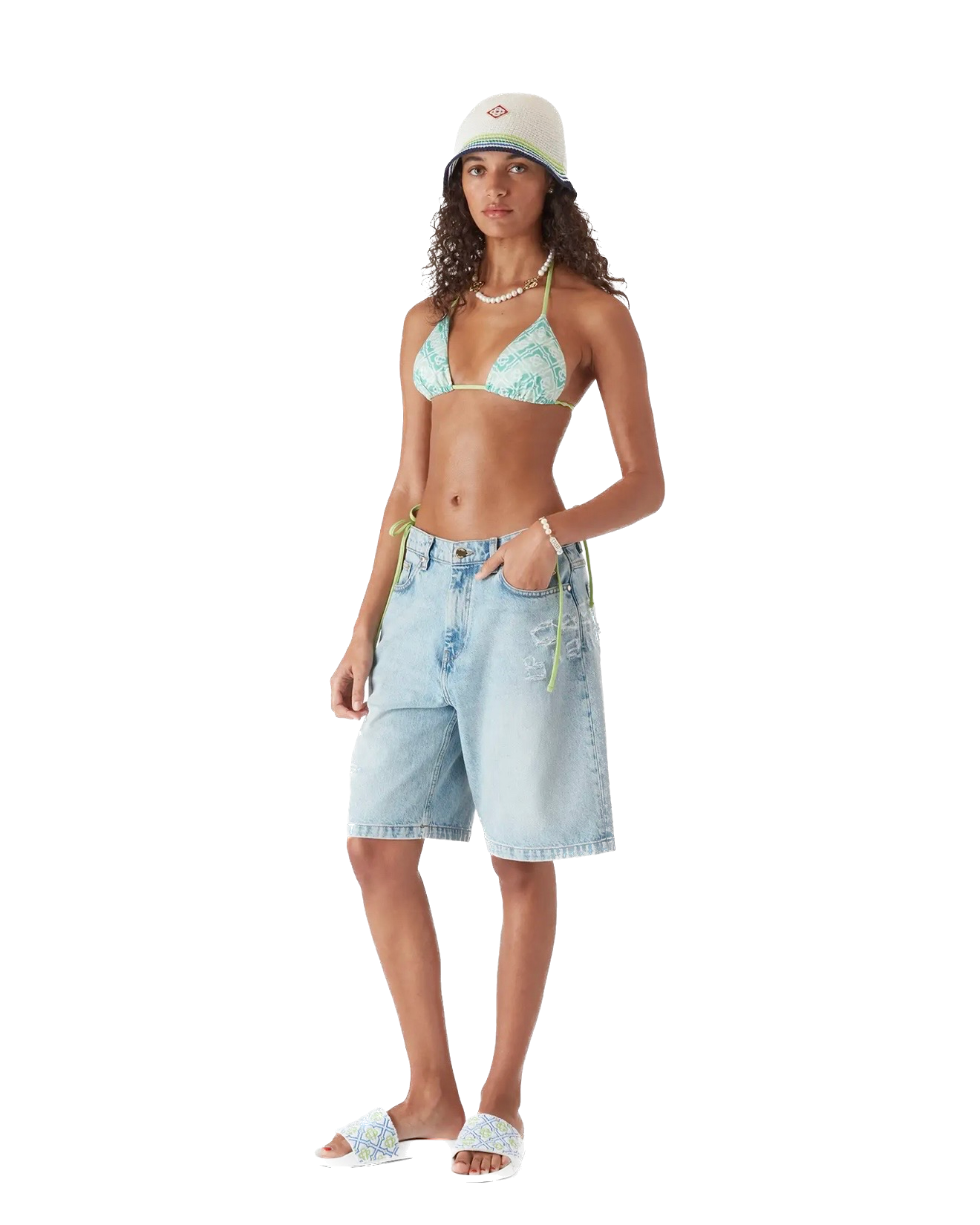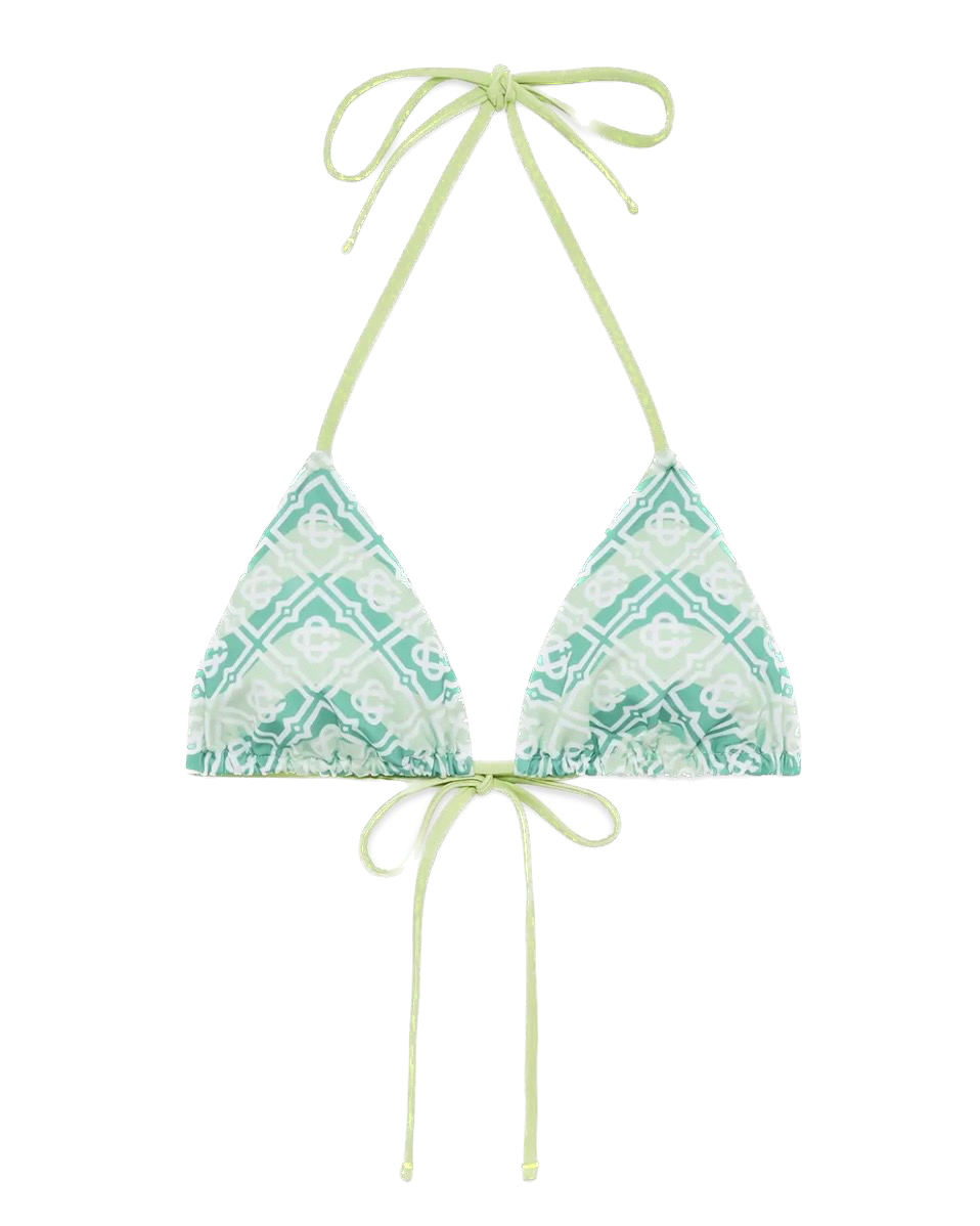 Le haut de bikini triangle à cordons Wavy Monogram est un modèle raffiné orné du motif monogramme de la maison sur un fond inspiré du mouvement de Memphis. Il est doté de fermetures à cordons à embouts dorés, de coussinets amovibles et du rivet CC entrelacé en plaqué or emblématique de la maison sur le bonnet gauche. Ce modèle est conçu pour être porté avec le bas de bikini assorti.