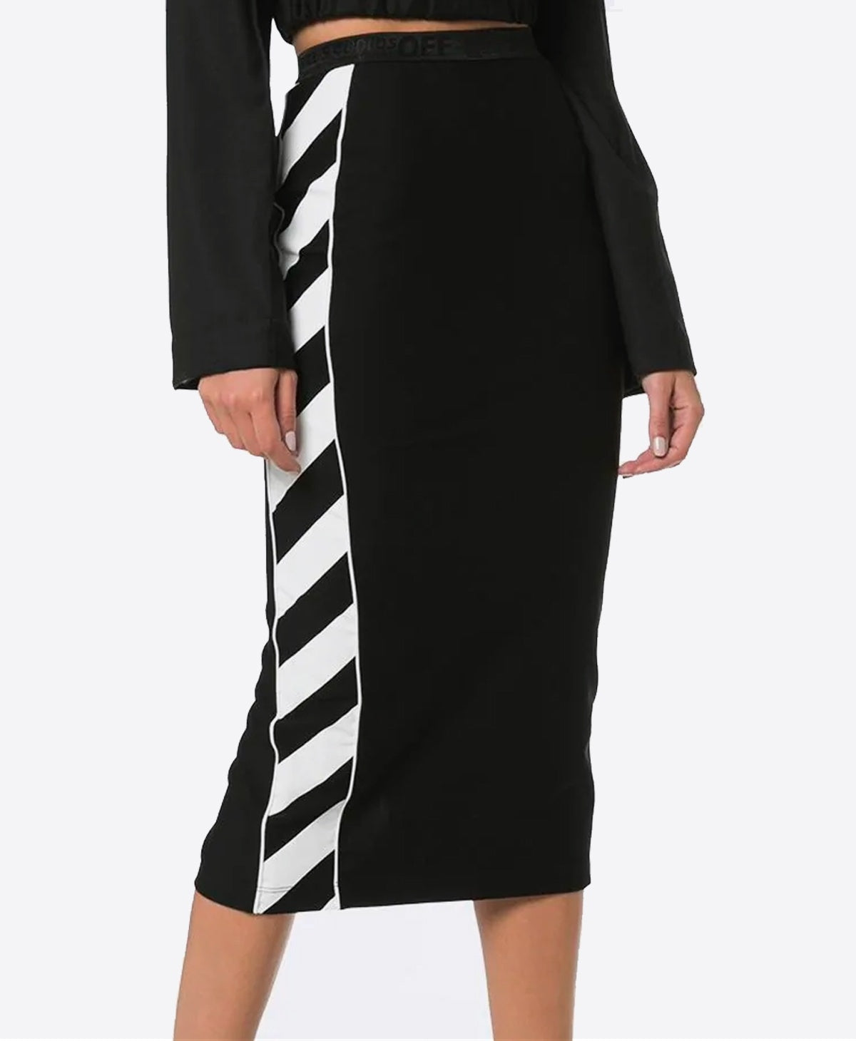 Jupe Off-White crayon mi-longue avec des rayures sur les côtés, une taille mi-longue et haute.