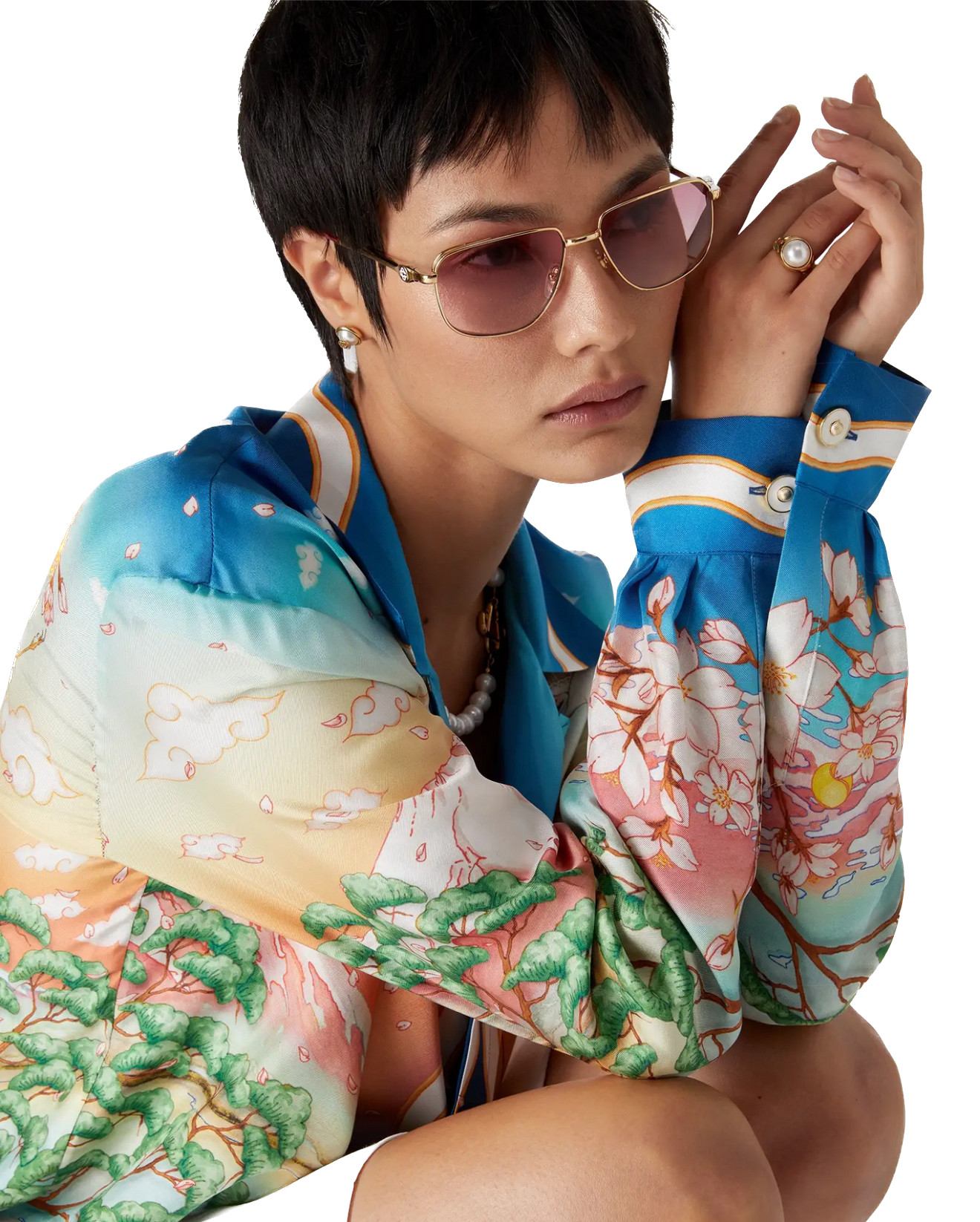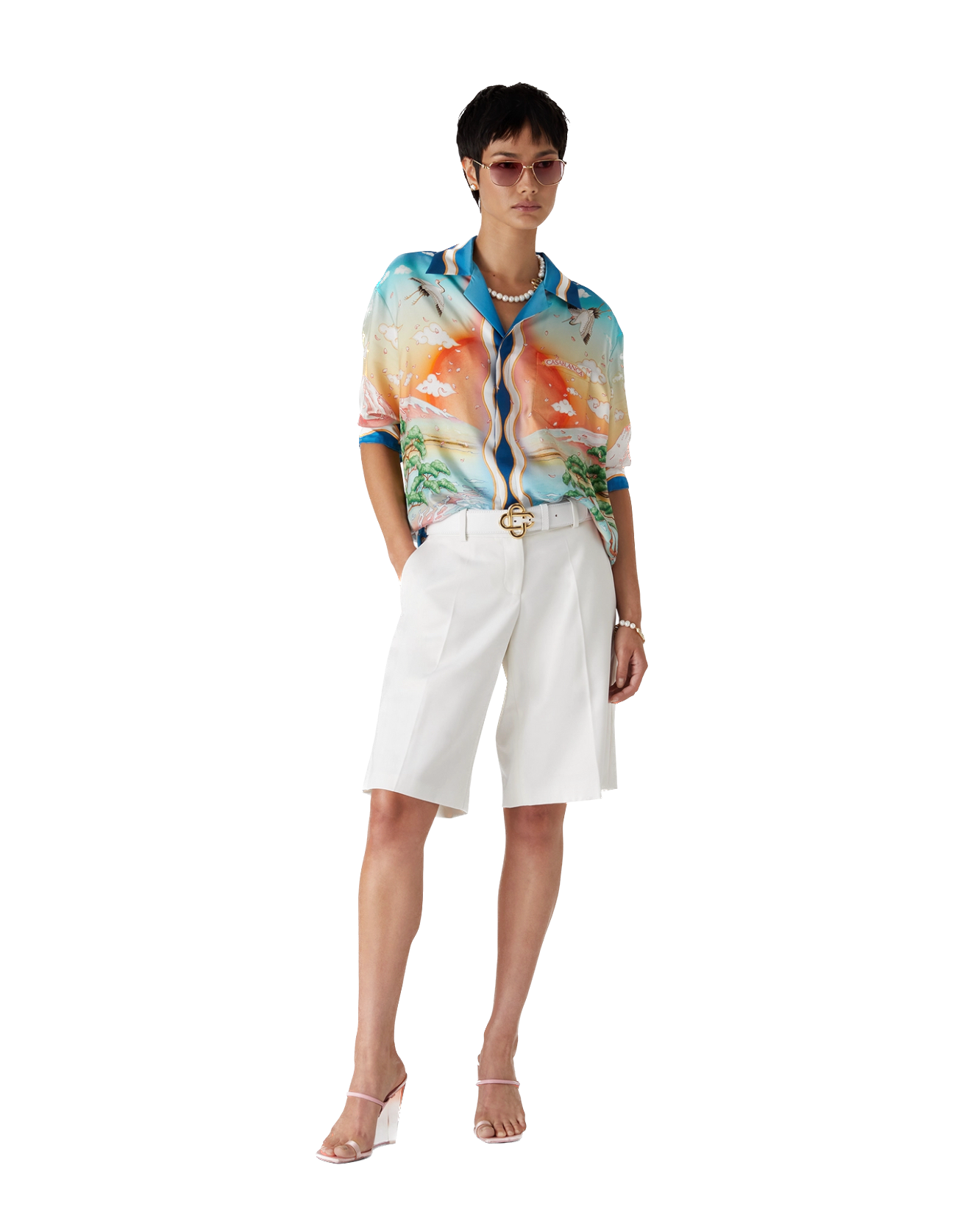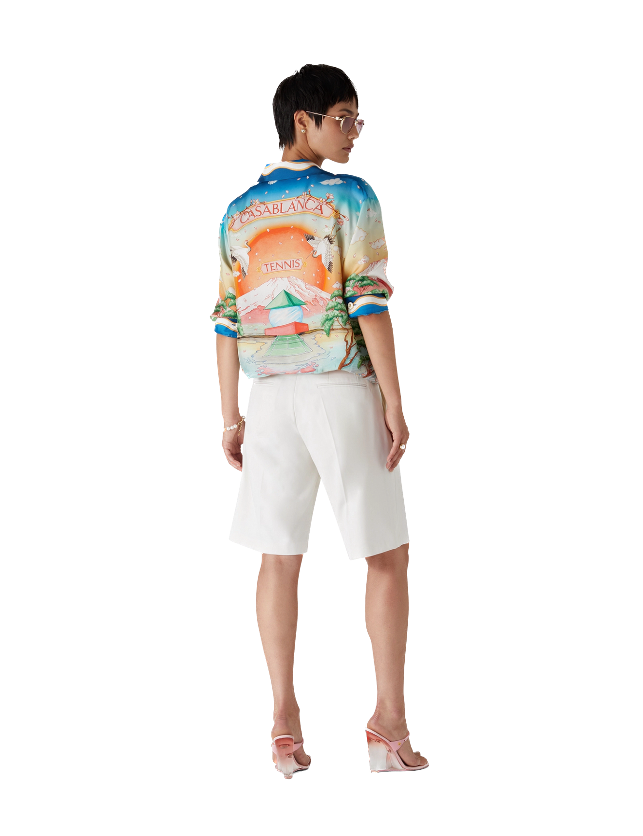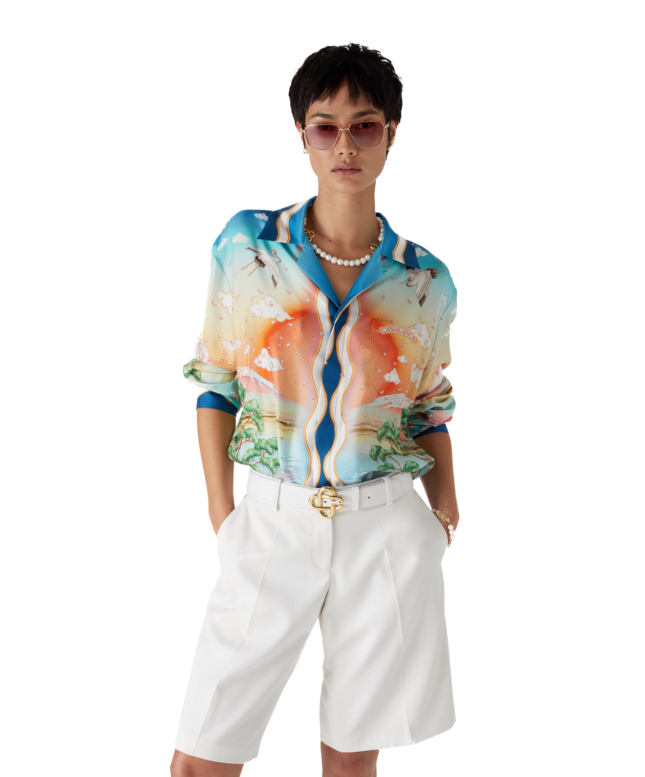 La chemise en soie Tennis Club est un design imprimé à manches longues présentant la version de cette saison du Tennis Club en utilisant notre disposition classique mais avec de l’art japonais traditionnel, ce qui en fait une pièce narrative très forte et une belle façon de fusionner les styles artistiques, réalisée en tissu twill de soie. Complété par une fermeture à boutons, des boutons en perle dorée emblématiques sur le col et les poignets, ainsi que des détails de rayures inspirés des vagues du design Memphis sur l’ourlet, les poignets, la patte et le col.