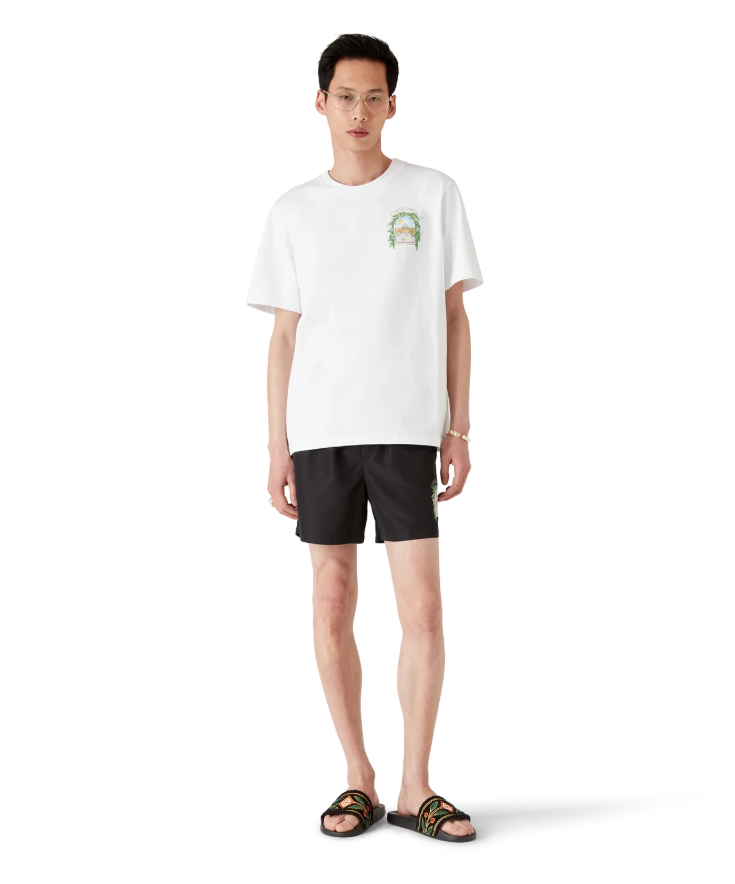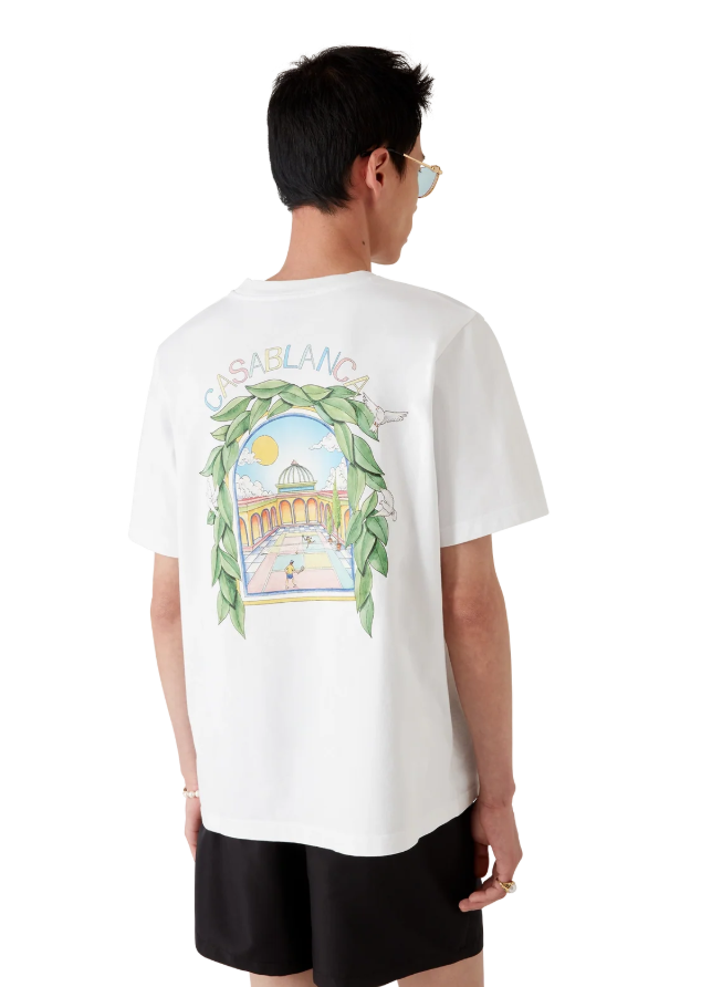 Le t-shirt L'Arche de Tennis est un modèle à manches courtes orné d'un motif sérigraphié de saison où la fluidité de la nature rencontre la structure du design humain : l'Arche, symbole abstrait de force. Il est doté d'un col rond classique.